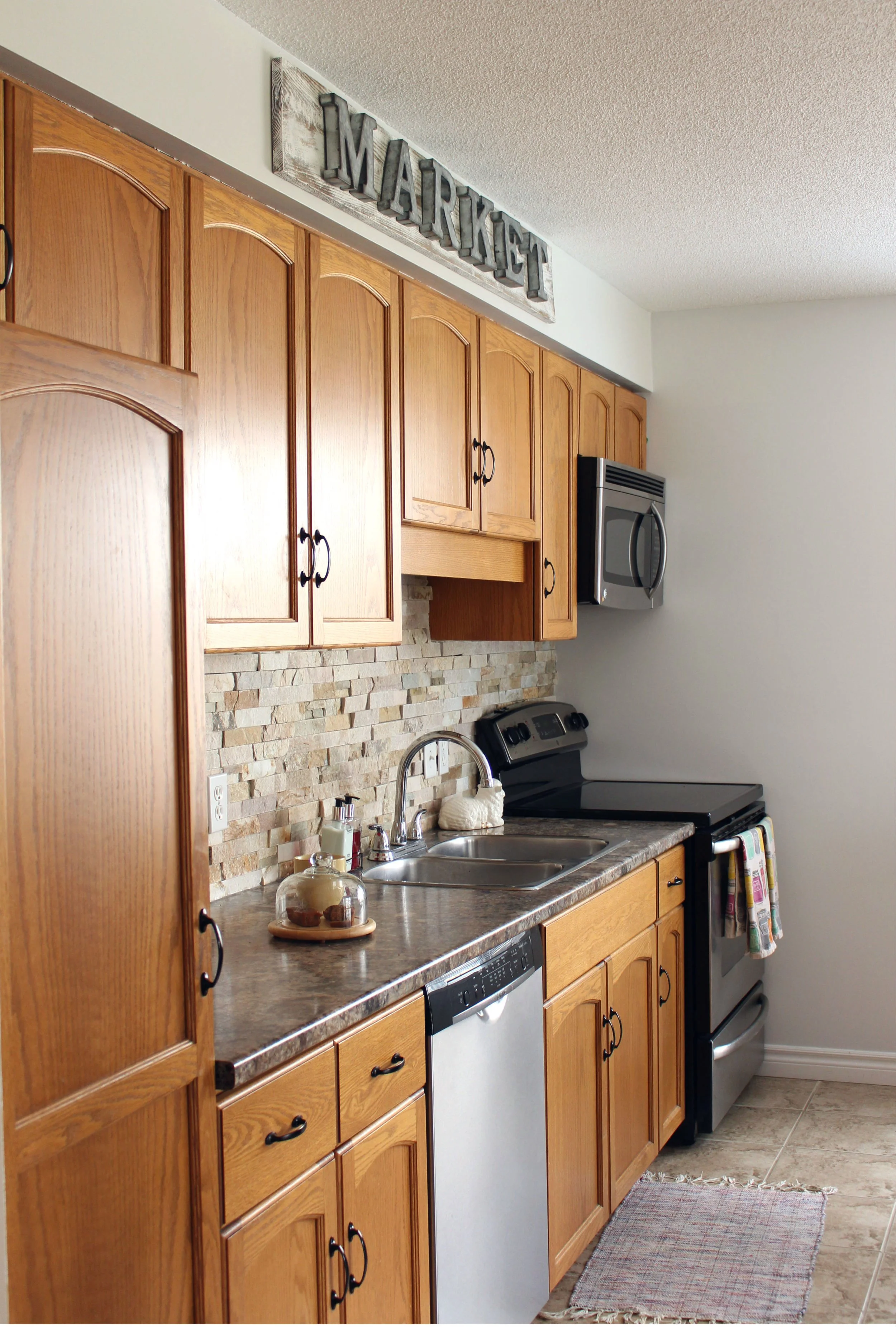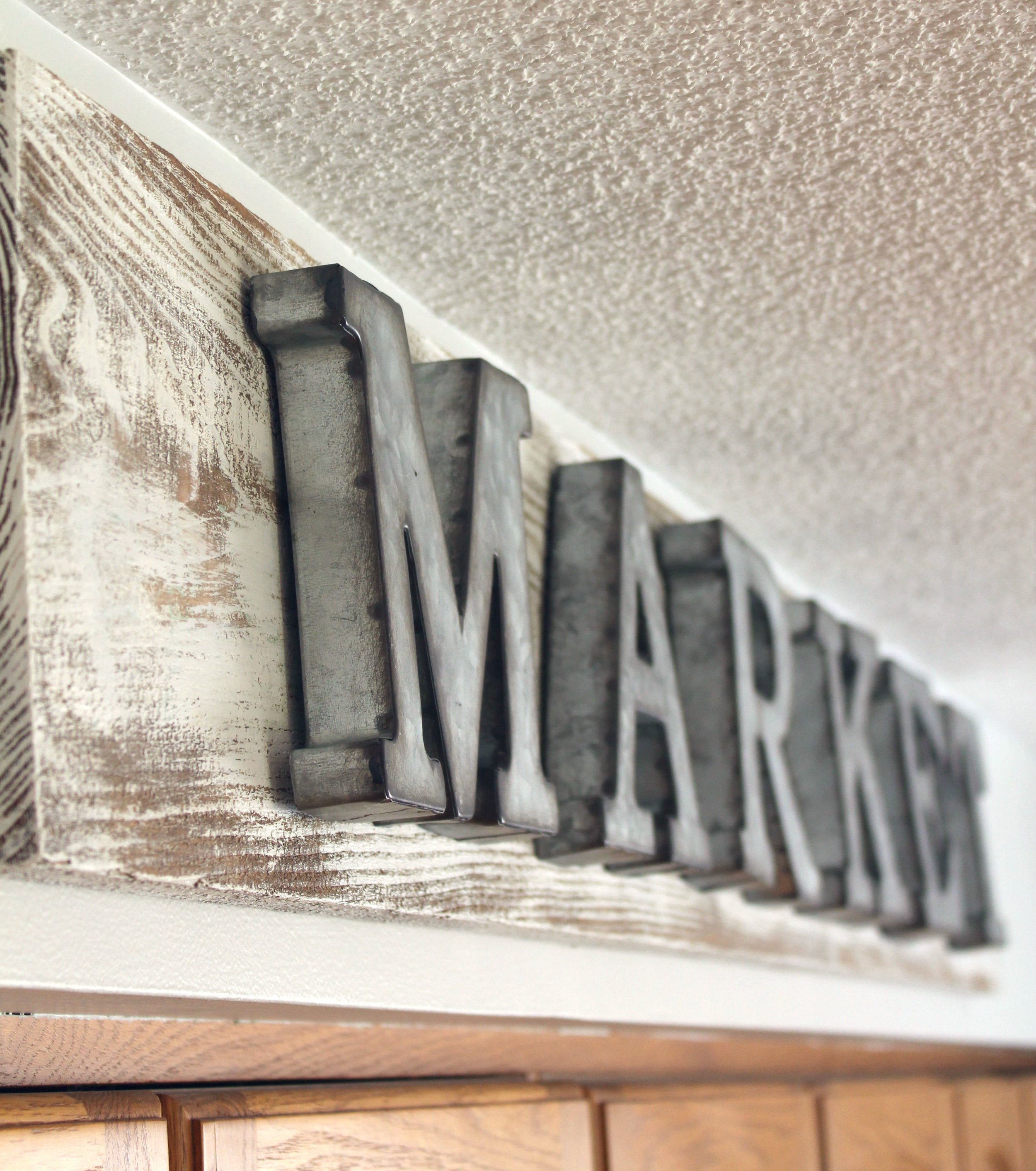 Step 3: Thankfully this barnboard is supposed to look weathered so that mess up added a little more character! After a lot of sanding and dry brush touchups, I spaced and hung the galvanized letters. Here's the improved Galvanized Market Sign! Now all we need to do is paint the existing cabinets, someday!The letters were purchased at Michaels. I'm not sure if they would have any left, I literally had to hunt down letters at multiple stores, and because I wanted to use my 50% coupons each time!