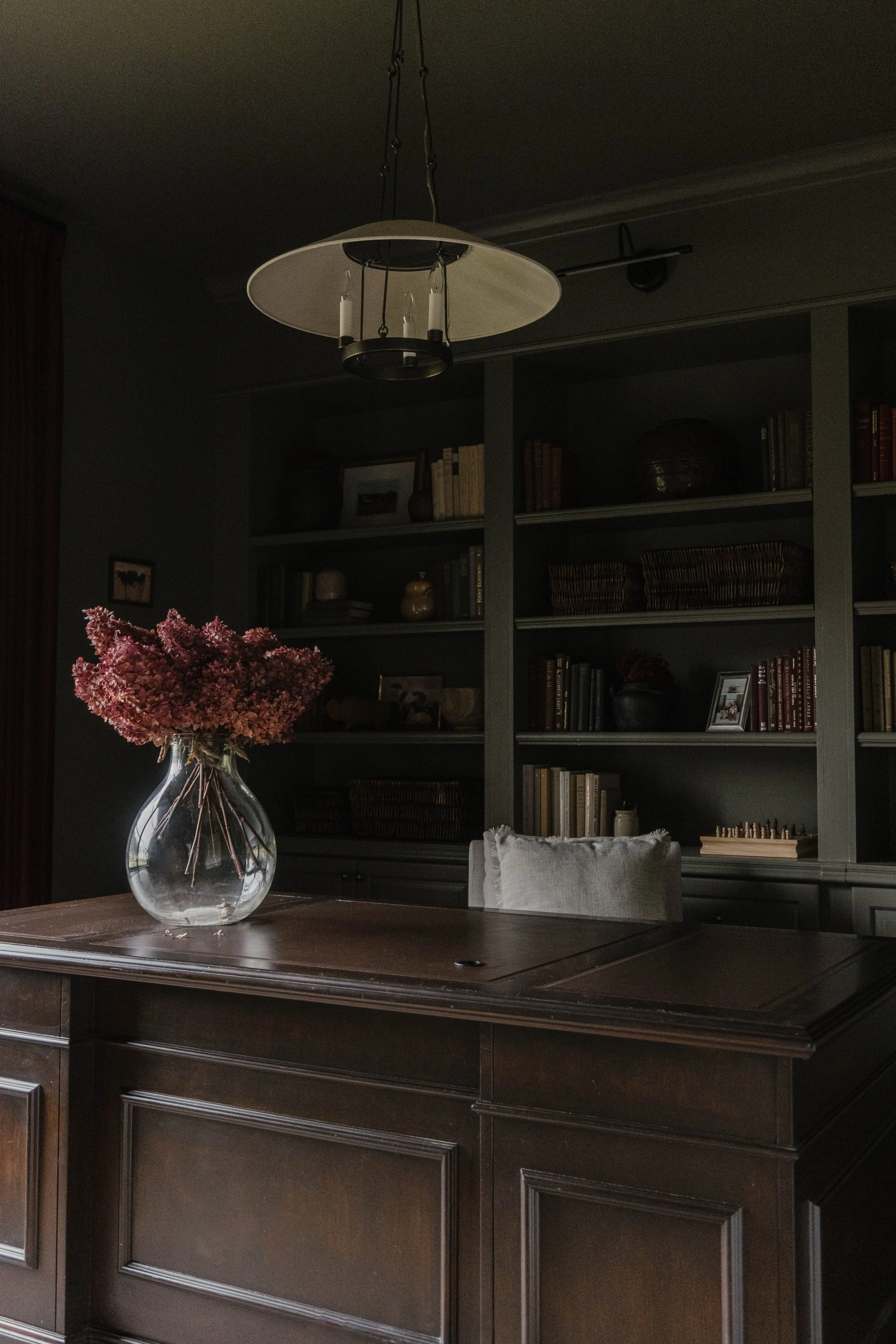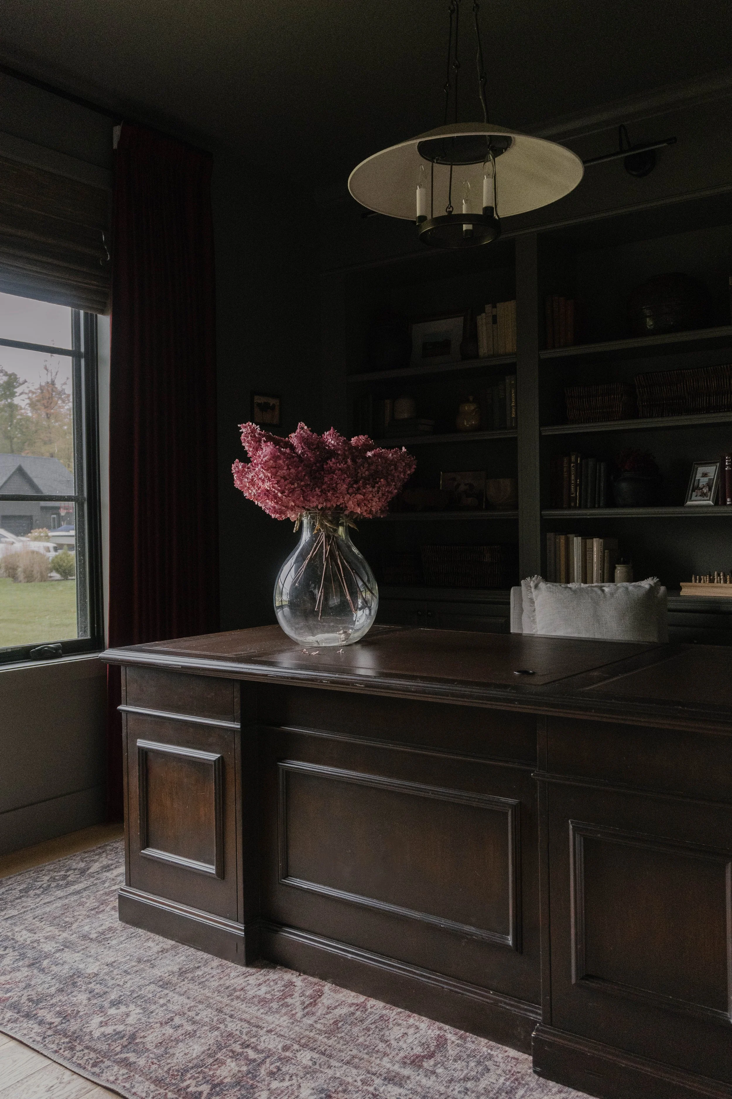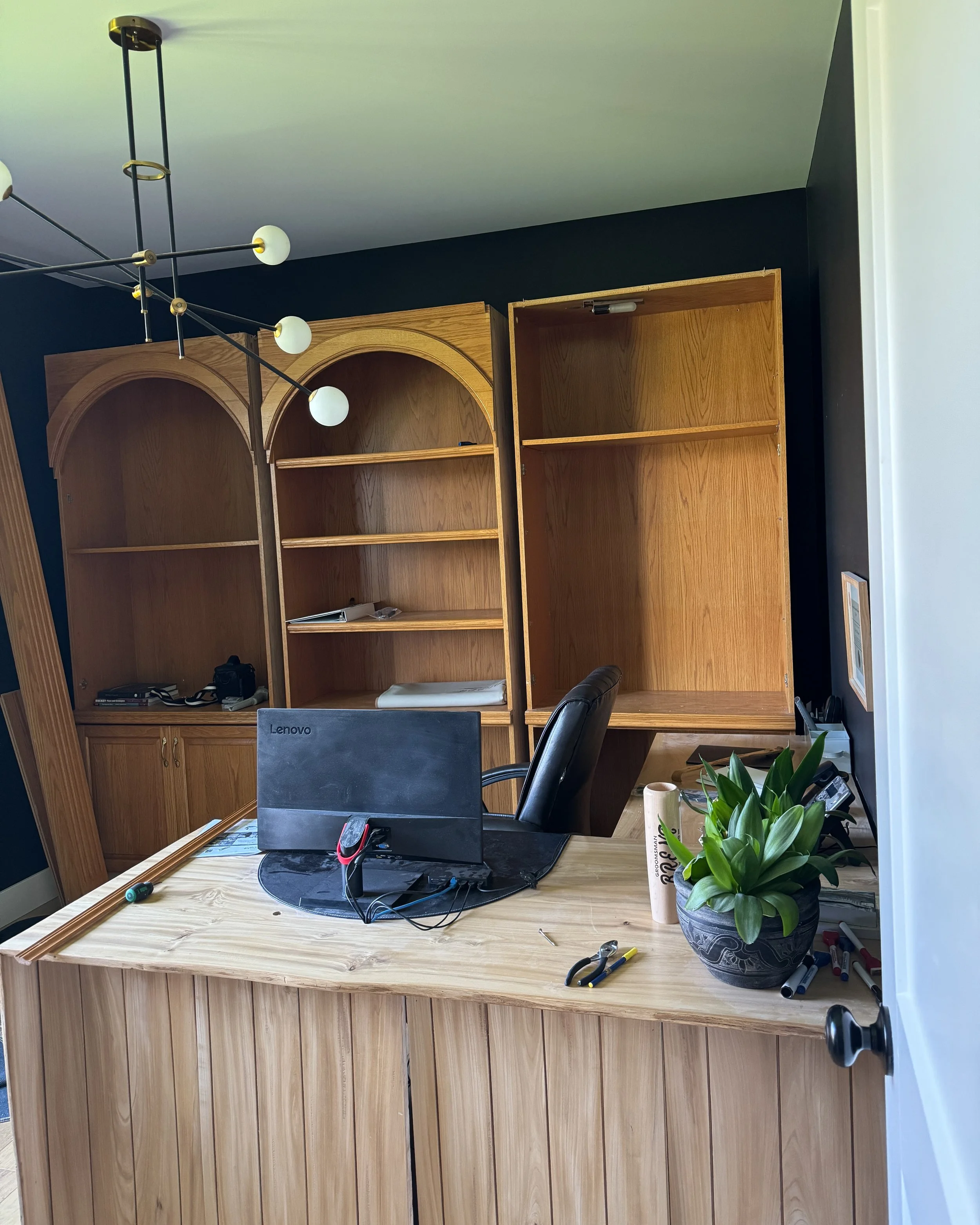 When we first moved into our home, the office was anything but inspiring. We painted the walls black, the furniture was a collection of random pieces, and the space just didn’t feel cohesive or functional. Brent’s dad had built us a practical L-shaped desk, which served us well for years, but I always dreamed of giving this room a true transformation, something custom, charming and timeless.