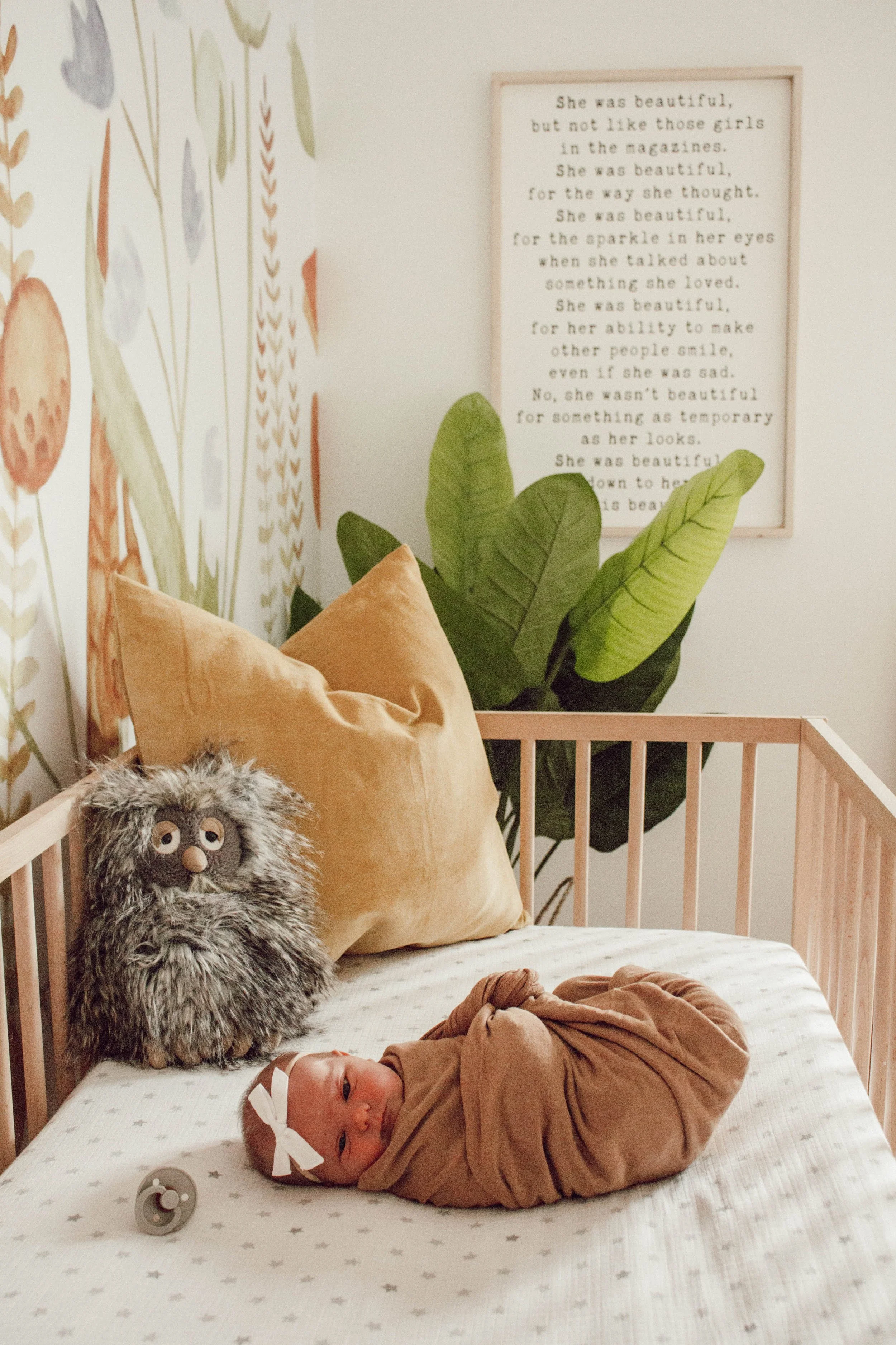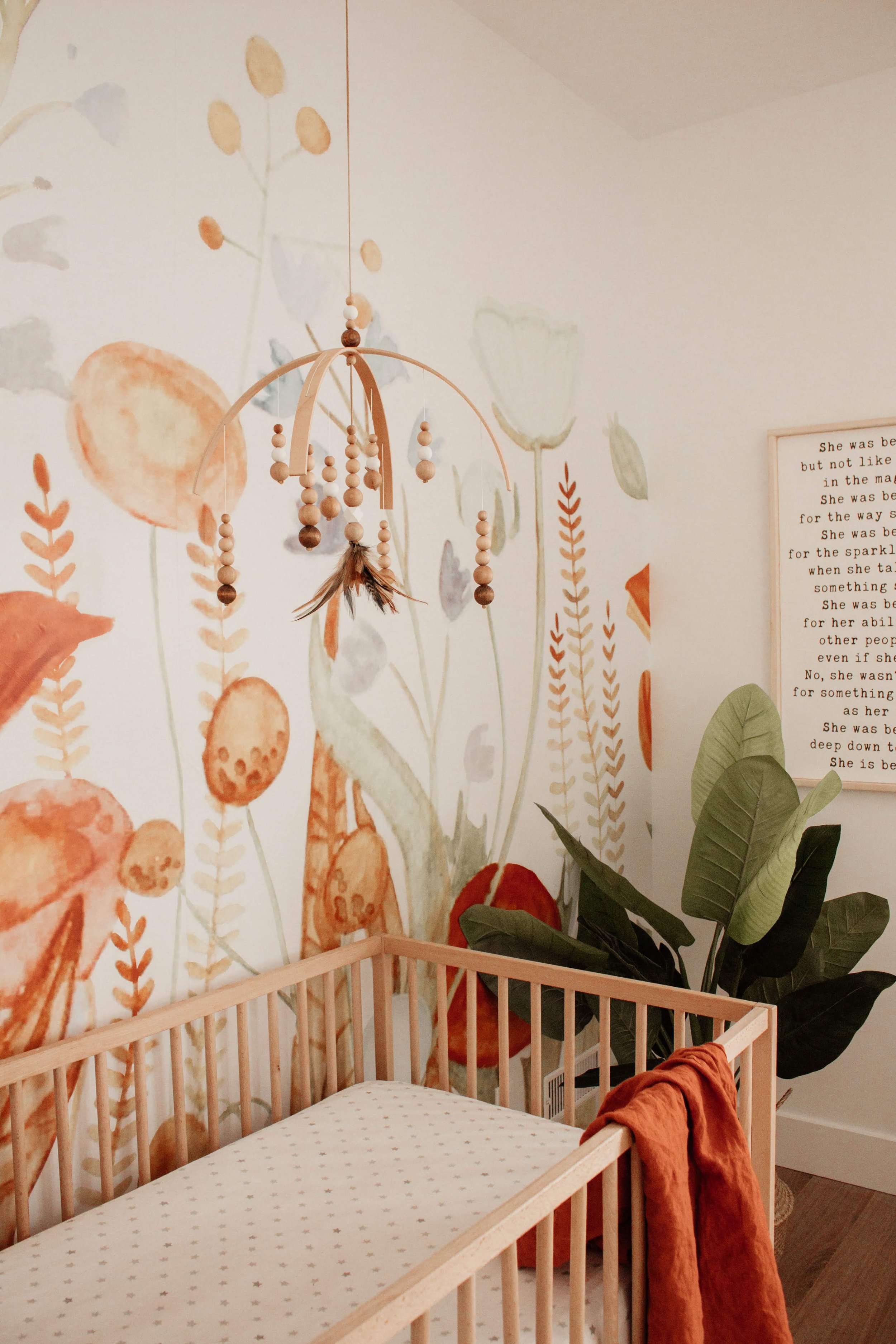 Me not being a huge fan of pink, I still wanted to keep Scottie's nursery cute and whimsical with that feminine feel... I found the cutest wall mural from Anewall and that is what we based our nursery decor around! From there we added a rocker and the cutest faux stool from Structube with a faux plant since this room doesn't get the greatest natural light (also = one less plant to keep alive, ha!).