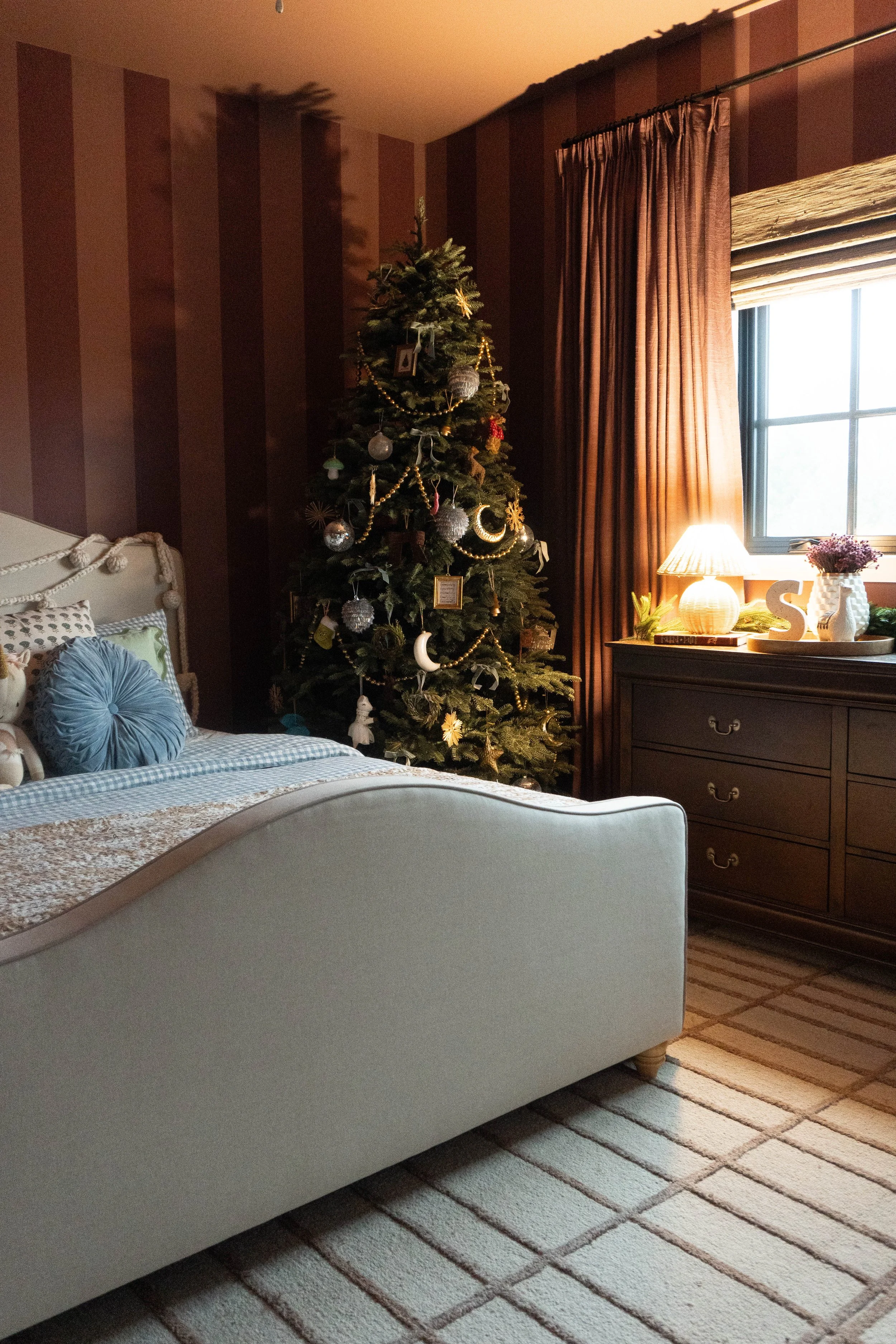 We also updated her window treatments with TwoPages, adding the finishing touch that ties the room together. Between the wallpaper, tree and little decorative details, Scottie’s bedroom has become a holiday haven that feels both cozy and magical.
