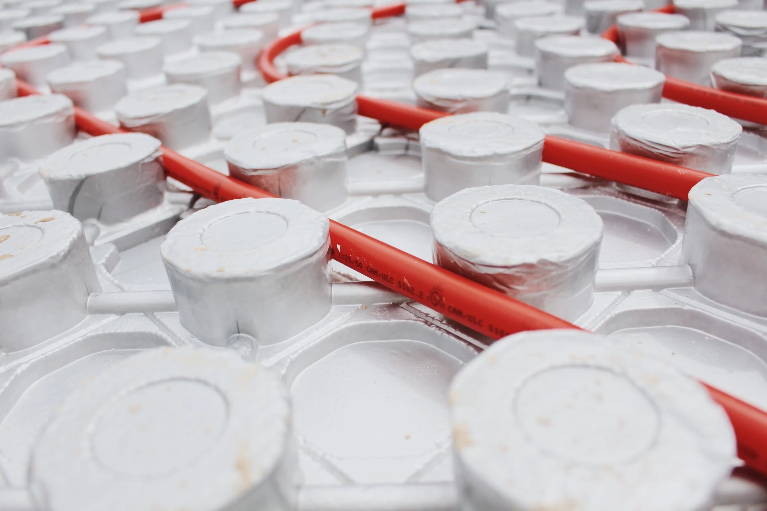 The panel nubs form a “mushroom” shape to lock the PEX piping byREHAUfirmly in place. The PEX piping is easily inserted into the panel simply by walking on the tube. Once inserted the pipe will be properly positioned and seated into the panel. The innovative patented panel design ensures that the tube will be completely encased in concrete and not pushed to the bottom of the panel. This will allow for the proper heat distribution of the radiant tubing and more efficient energy transfer.