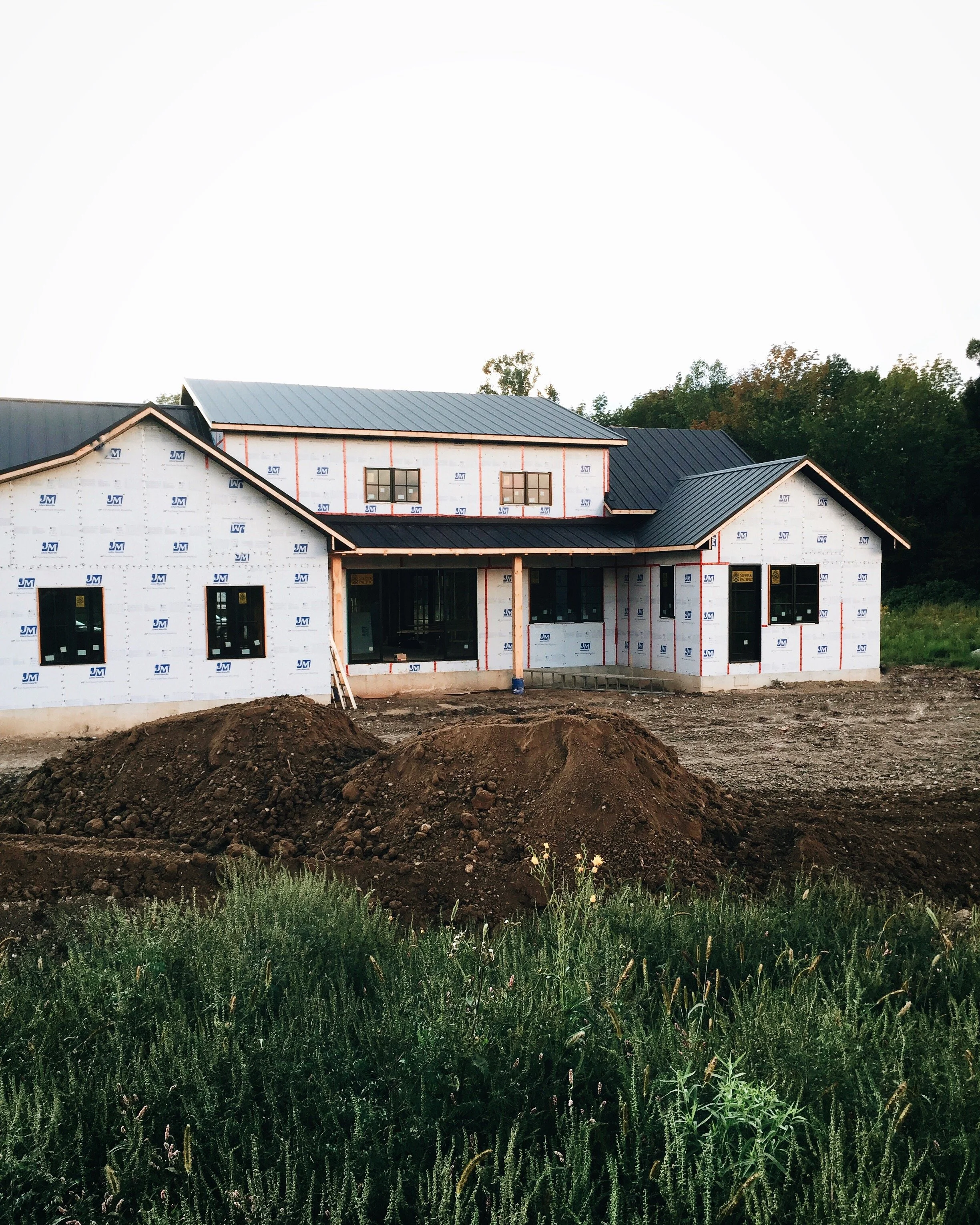 Last time I posted about our house progress, we had most of the framing done. Now we are seeing lots of progress to the exterior as our metal roof is almost complete, the windows have been installed, the stone ordered and the siding colour finalized!