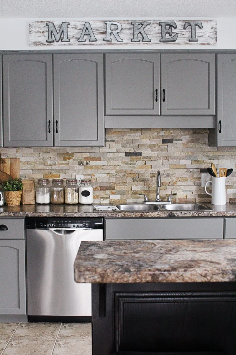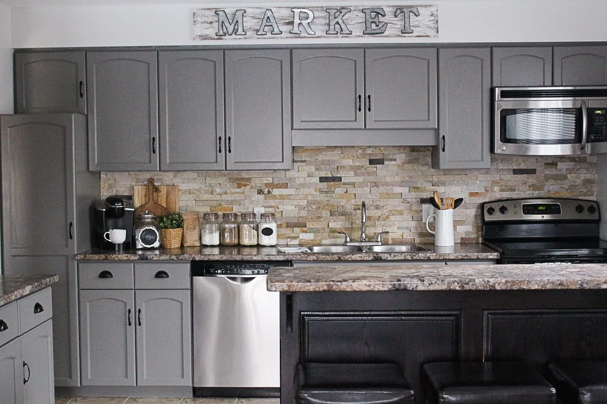 When we were first time home buyers, I had no idea what specific interior style I was drawn too- our only concern was to have functioning furniture. Well fast-forward 4 years later and our kitchen has went though the most changes within our home. From tearing down a little half wall to multiple colours on the wall, it's about time our kitchen has finally come together!With my biggest DIY yet, last fall I decided to go for it and paint our kitchen cabinets grey, YUP grey, not white... I remember my father-in-law saying "grey? Hmmm". Because grey kitchen cabinets were hardly known and I think most people remember the popular 90's oak kitchen while grey was non-existent. But once my father-in-law saw them, it was a no brainer that grey suited this kitchen to a T. I'm still in love with the colour and it really flows beautifully with the rest of our home, plus now our dining area has new table and chairs which really pull the whole kitchen and dining area together!